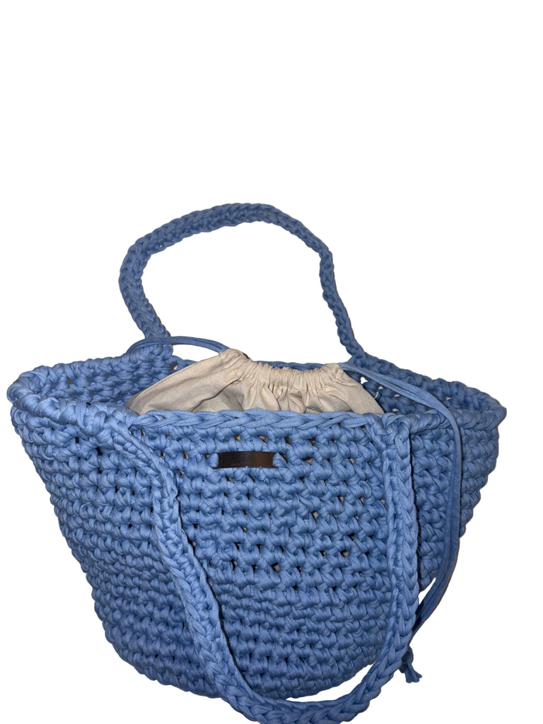 The Ameerah Crochet Bucket Bag is a stylish handmade bag featuring a beautiful textured crochet design. Made with sturdy, durable recycled t-shirt yarn in a vibrant light blue colour, it offers both structure and comfort with its sophisticated handles.