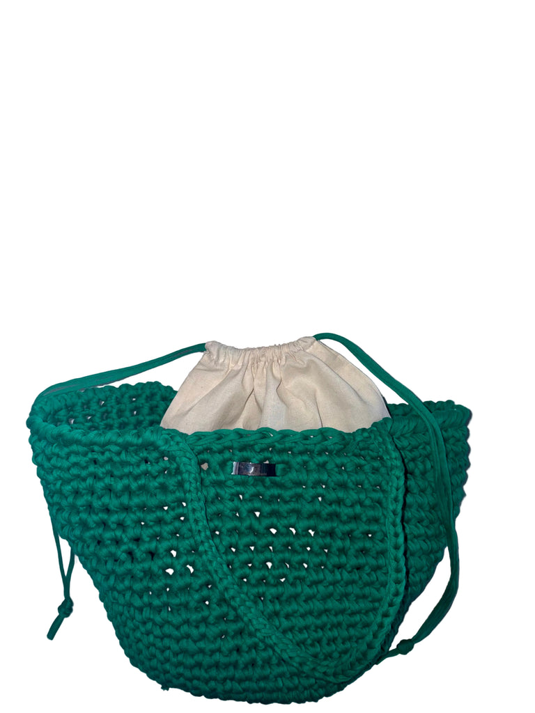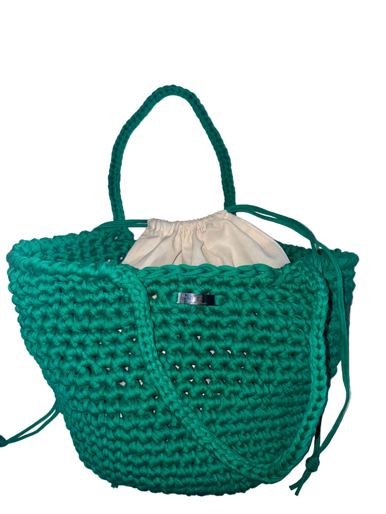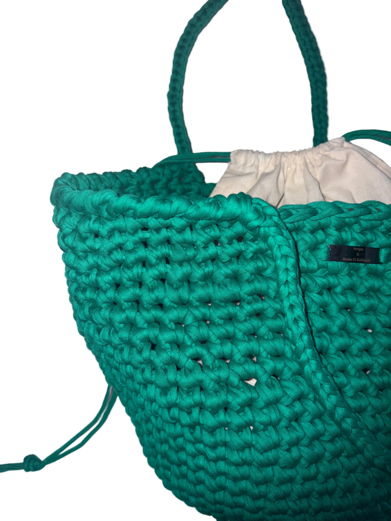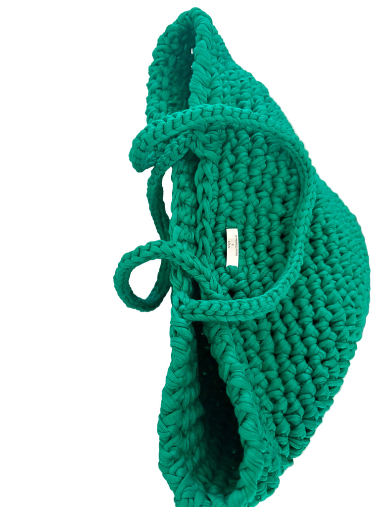 The Ameerah Crochet Bucket Bag is a stylish handmade bag featuring a beautiful textured crochet design. Made with sturdy, durable recycled t-shirt yarn in a vibrant green colour, it offers both structure and comfort with its sophisticated handles.